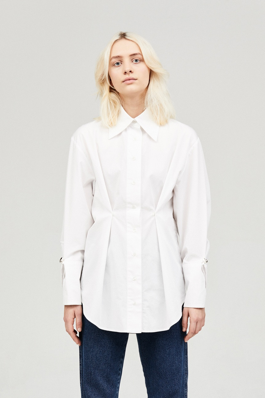 Oversized shirt with curved hem and long collar tips, 11cm. Button and button hole detail on sleeve cuffs that changes the sleeves from kimono style to more sculptured sleeves. At waist there is a button and button holde detail, front and back, which makes it possible to have a relaxed waist or a more feminine, ’tucked in’ , waist.