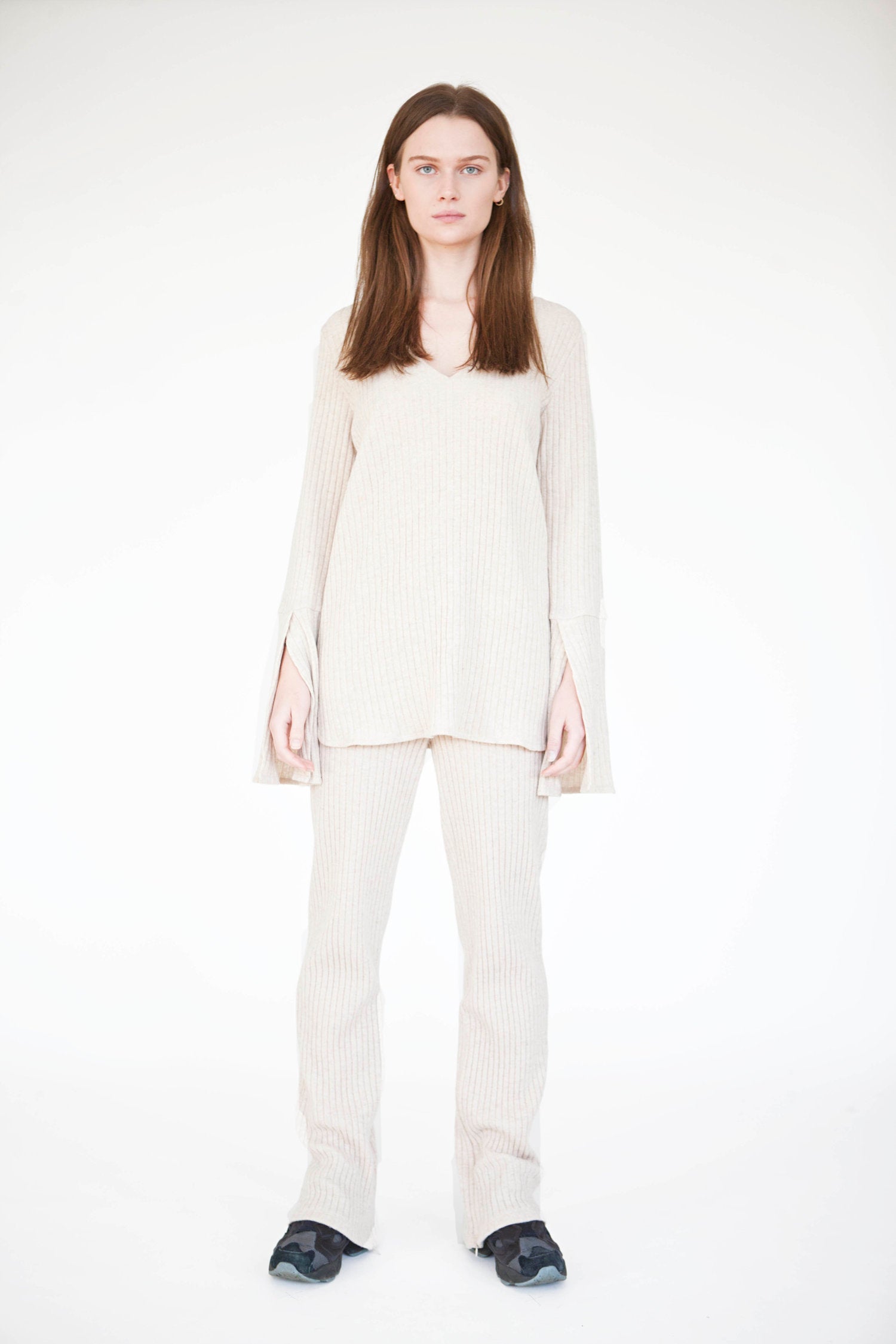 V-neck top with a relaxed and slightly oversized fit. Hem is curved. Sleeves are slightly long with a split detail from below elbow to cuff.
